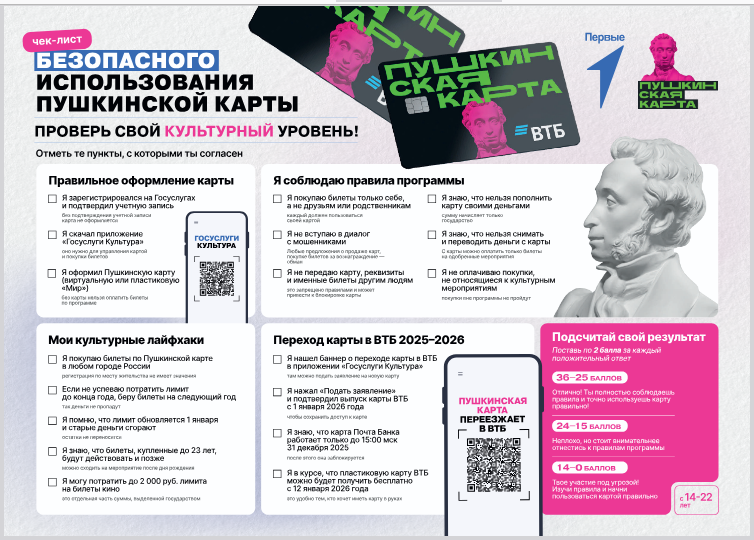 Пушкинская карта предназначена исключительно для приобретения билетов на культурные мероприятия, перечень которых утвержден Министерством культуры РФ. Попытки использования карты для других целей, в том числе для снятия наличных или оплаты товаров и услуг, не связанных с культурной сферой, являются незаконными и могут повлечь за собой блокировку карты.